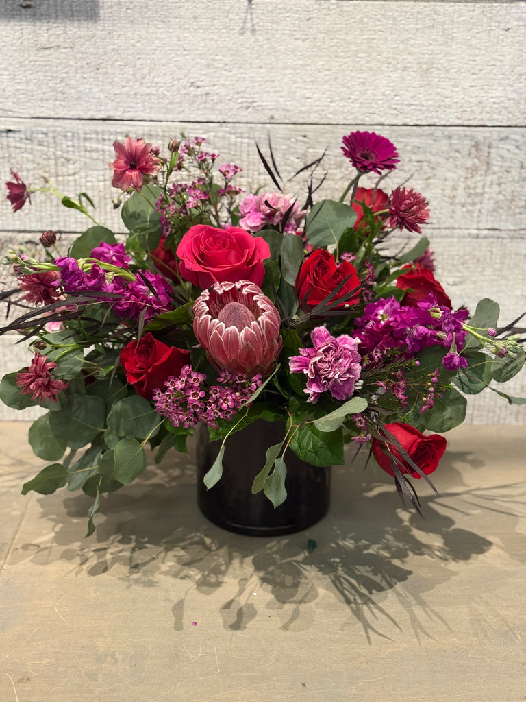 Show how crazy in love you are with this lush arrangement filled with mixed pink and red flowers in a glossy black vase! The specific mix of flowers will vary, though every arrangement will include red roses.
