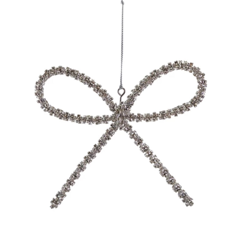 Silver metal shoestring style bow ornaments with clear rhinestone embellishment.