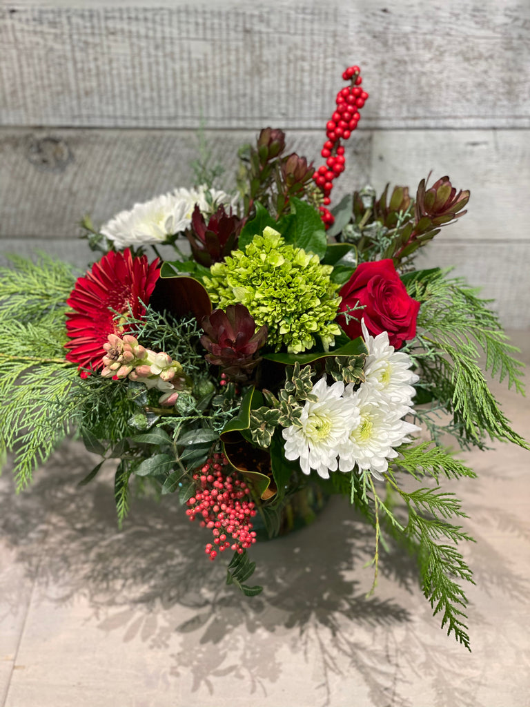An adorable recycled glass bubble vase with a seasonal variety of flowers, and a mix of holiday greens.