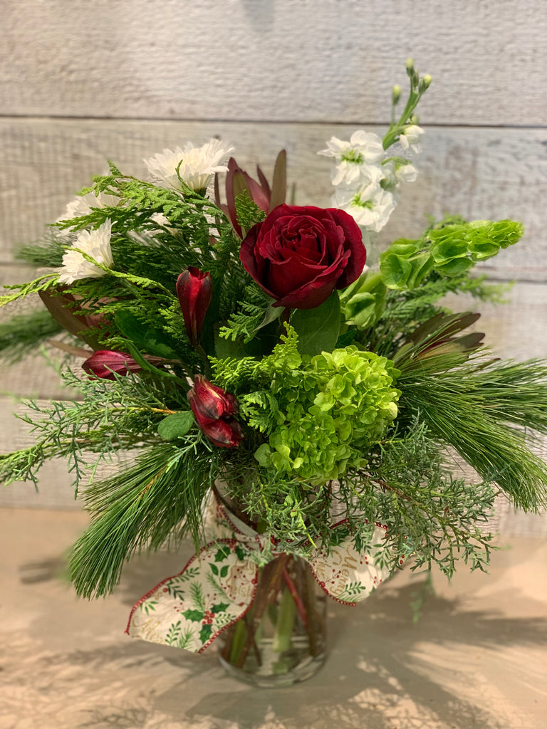 Have yourself a Merry Little Christmas with a simple mix of seasonal blooms in reds, whites, and greens.