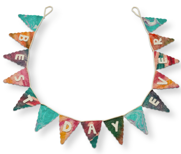 Hand-crafted tie-dye wool felt garland with loops for hanging and the words "best day ever". Perfect for birthdays, anniversaries, new pets, or any "best day ever" celebration!