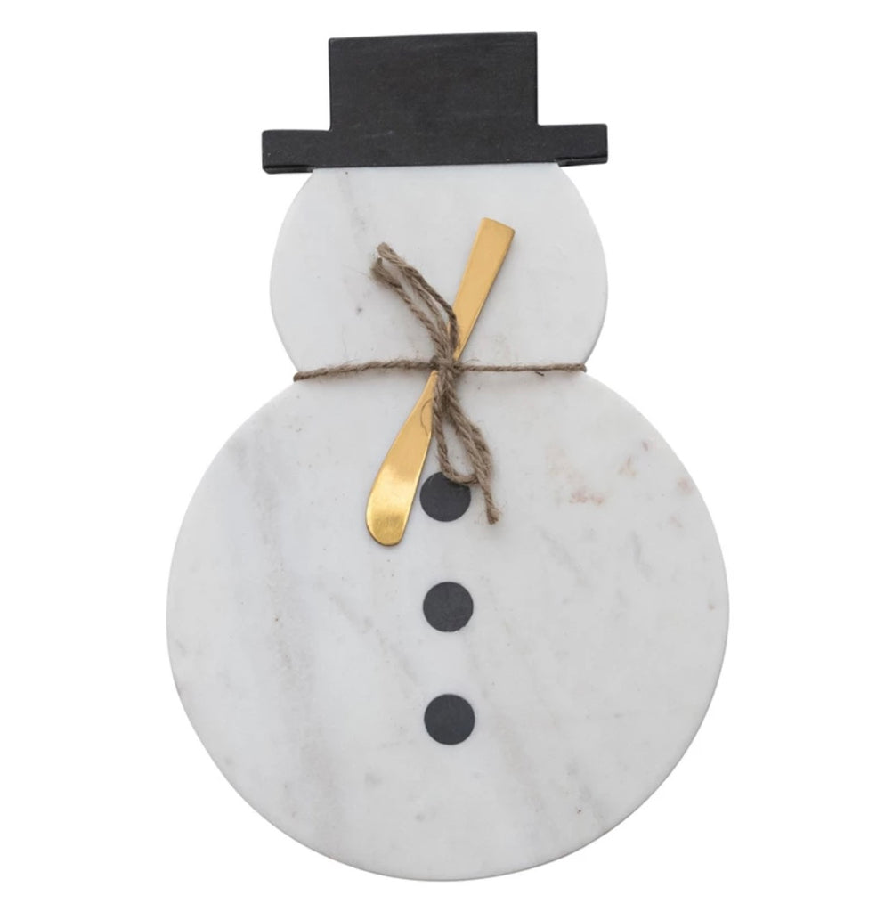 This white and black marble snowman-shaped cheese and cutting board is a cute and chic piece that will enhance the dining experience. It is ideal for serving cheese, crackers, fruits, or other snacks in style. It is easy to clean with a damp cloth and mild soap. Hand wash only.